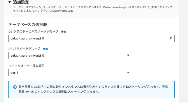デフォルトのAuroraクラスターで、デフォルト設定でReadレプリカを追加すると、フェイルオーバー優先順位が「tier-1」で作成されます。