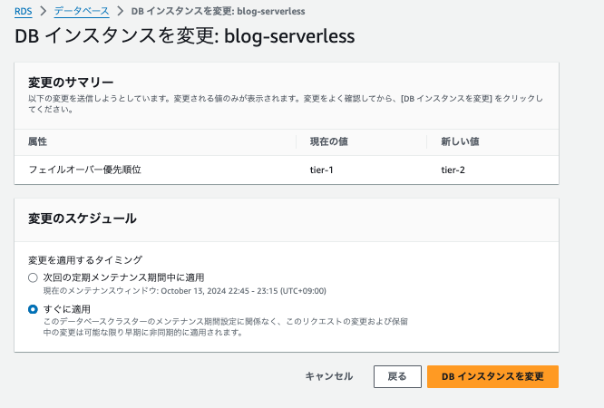 上記の場合、Serverless v2インスタンスはWriterインスタンスのスペックに追従する必要がないので、フェールオーバ優先順位をtier-2にします(tier-1より下であればOK)。