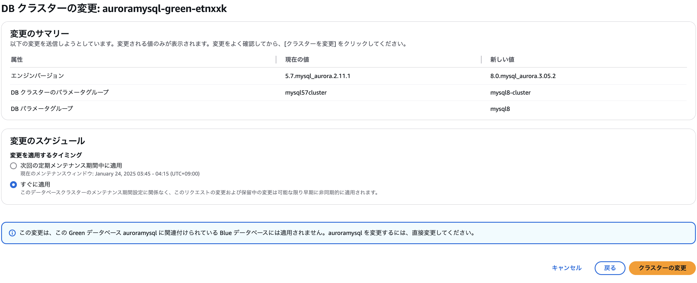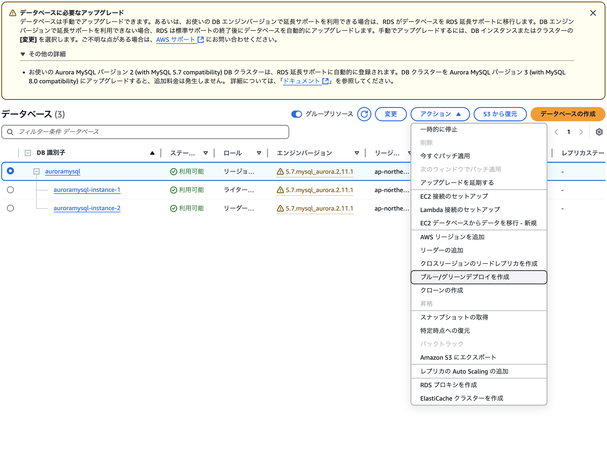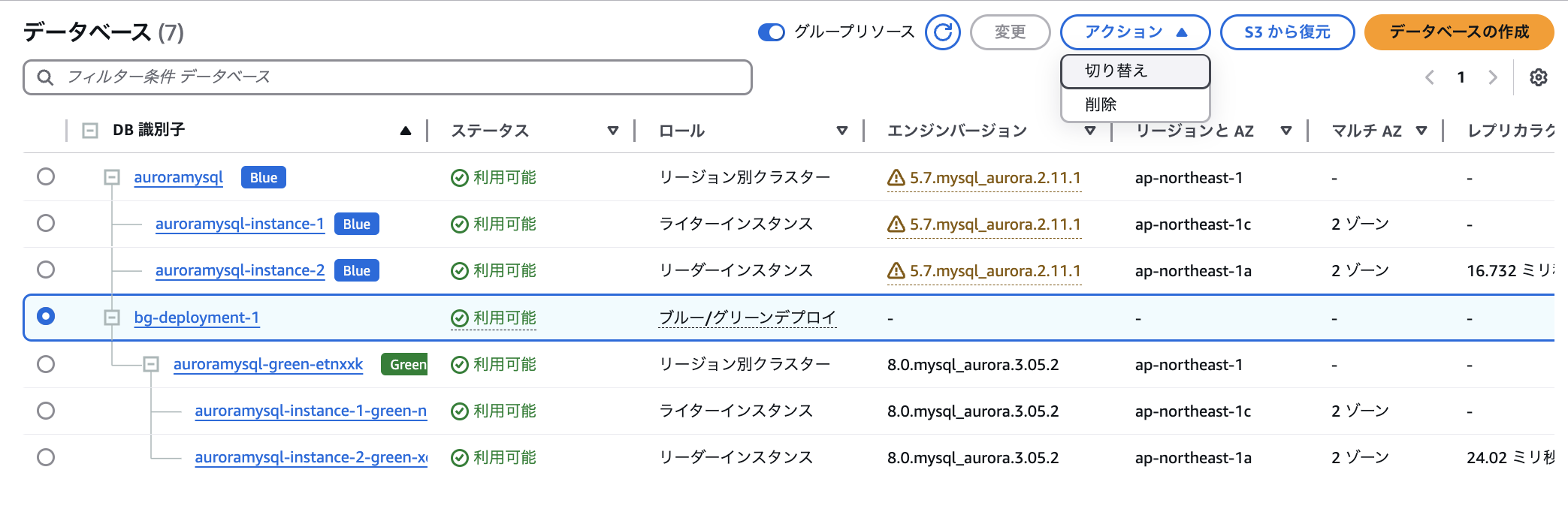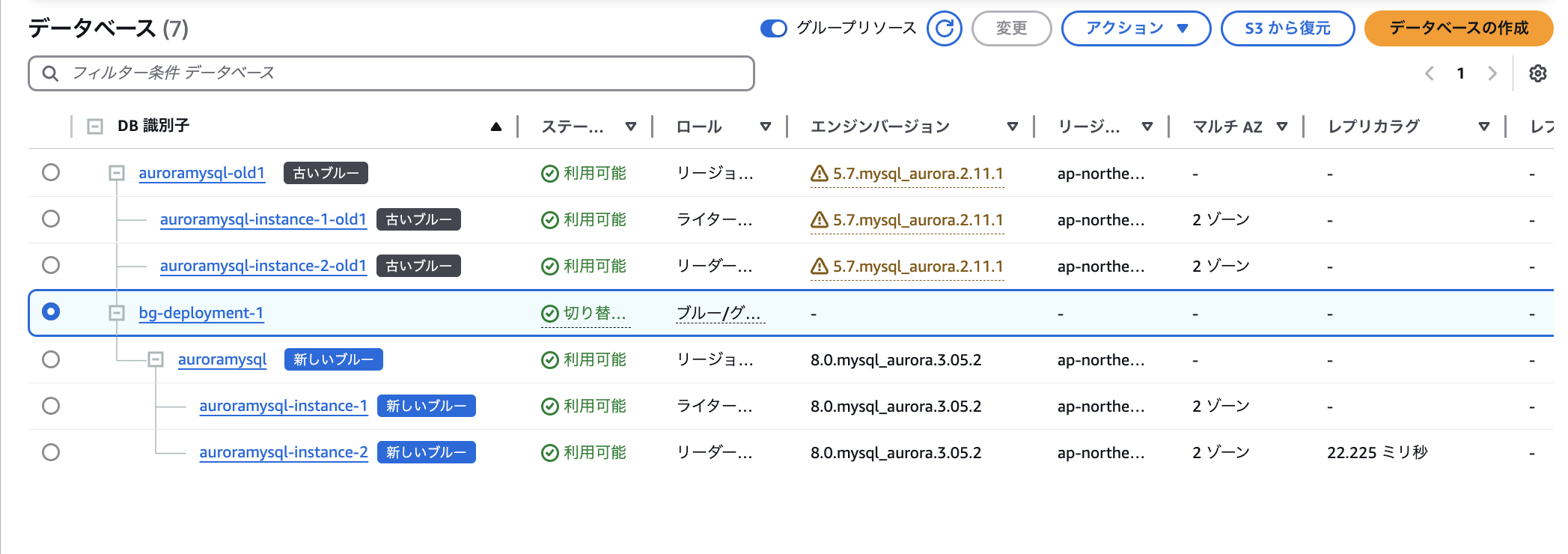 - 大規模なデータベースの場合は、まずはMySQLのバージョンを同じにしてgreen環境を作成し、その後手動でgreen環境をアップデートを実施するほうが安全です。