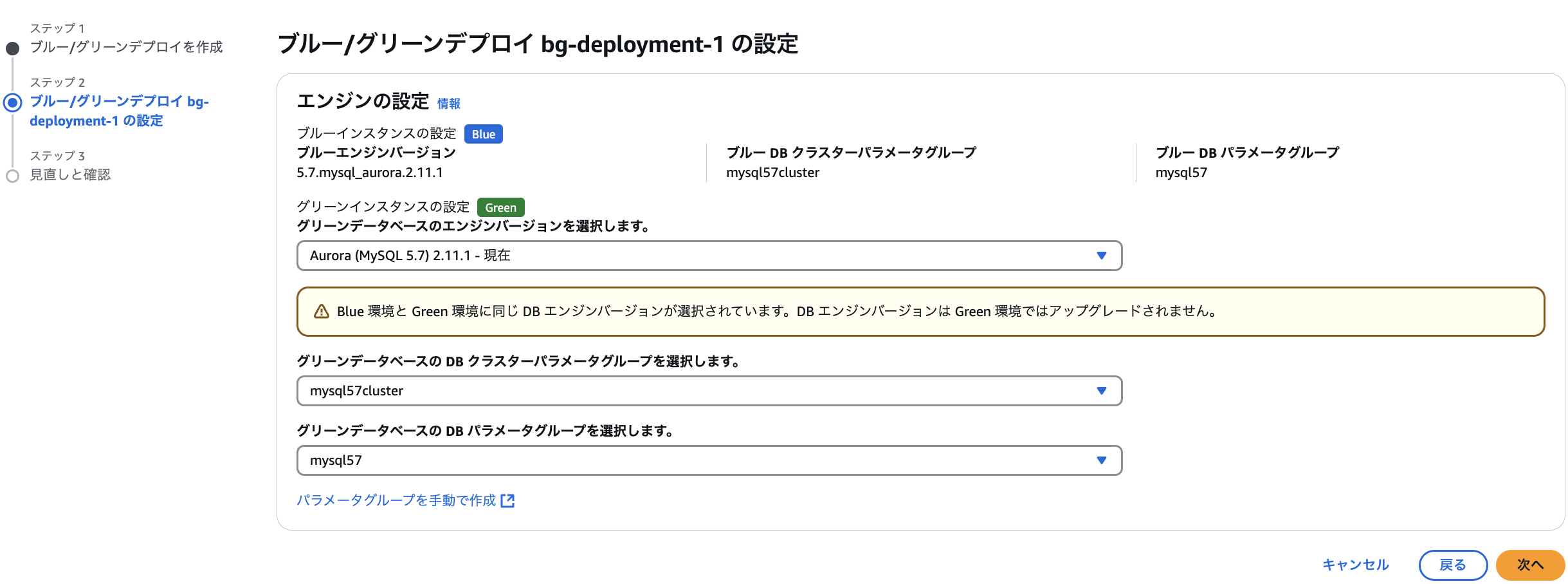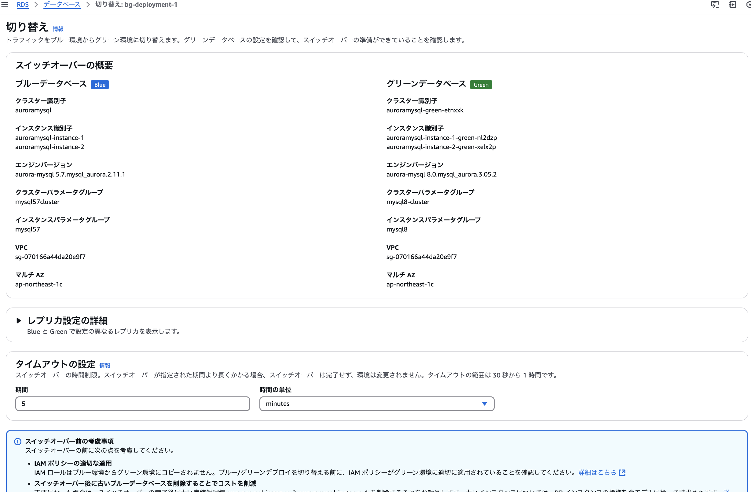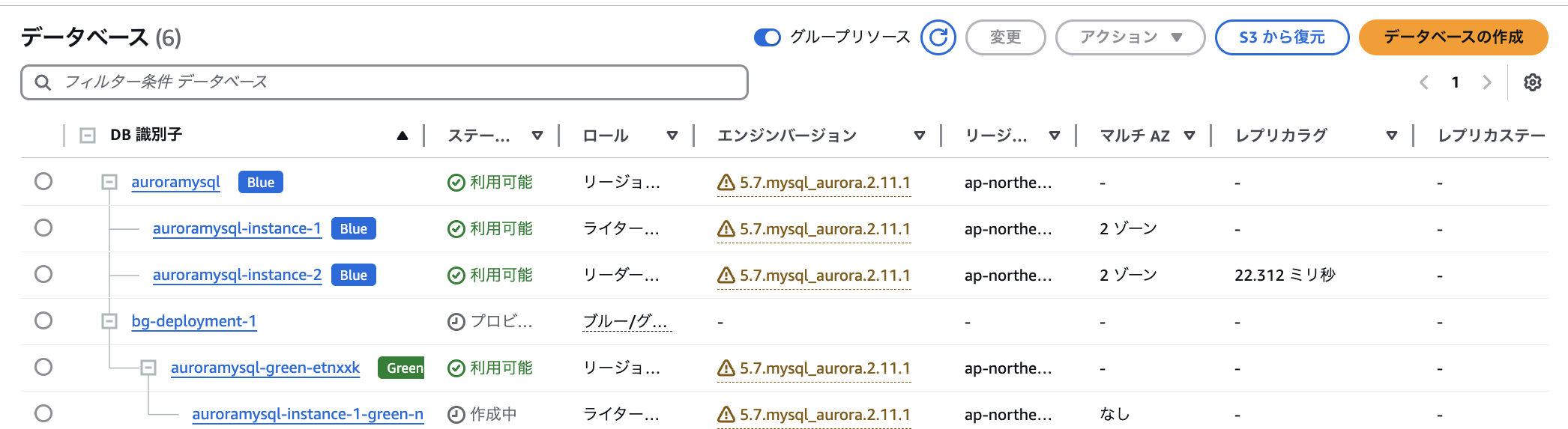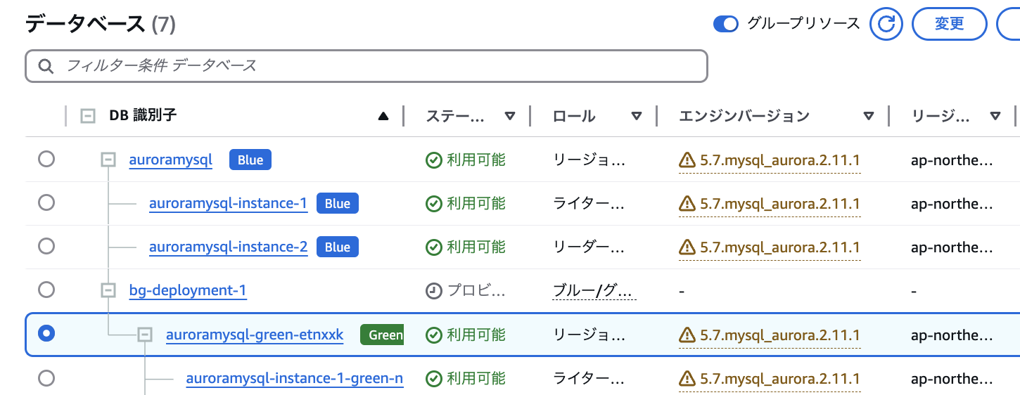 - 大規模なデータベースの場合は、まずはMySQLのバージョンを同じにしてgreen環境を作成し、その後手動でgreen環境をアップデートを実施するほうが安全です。