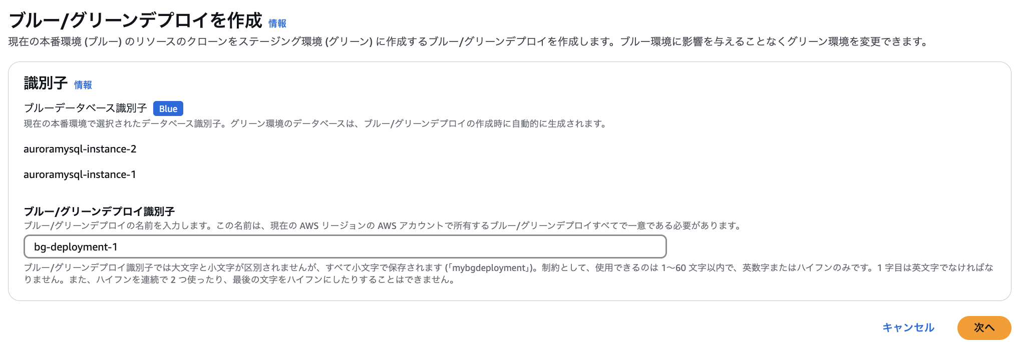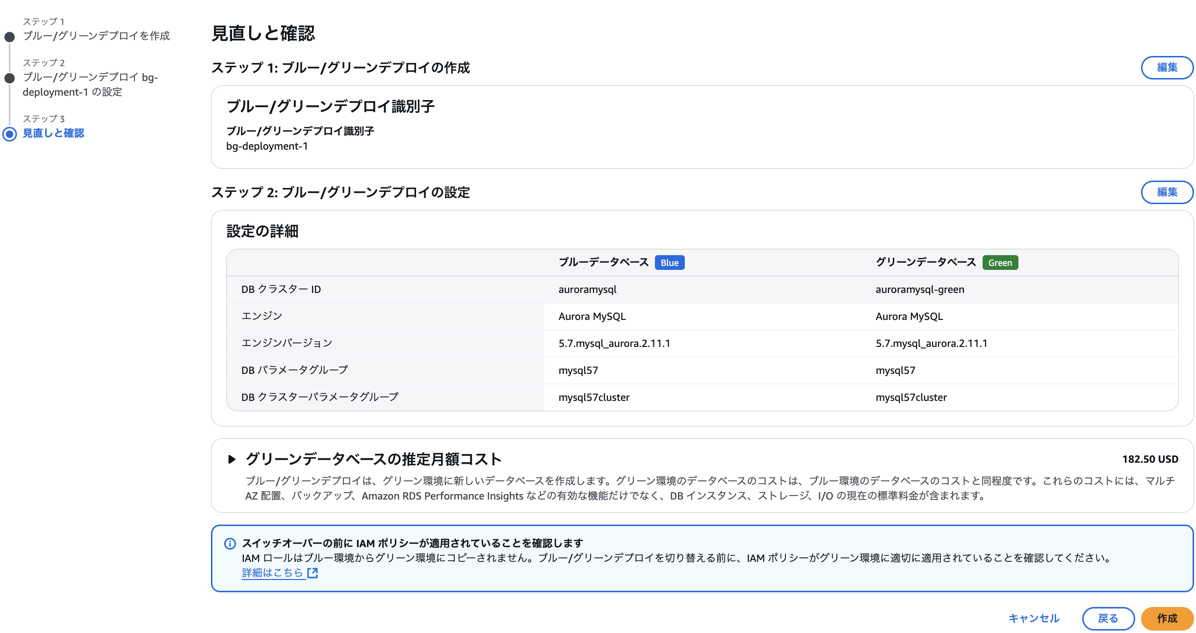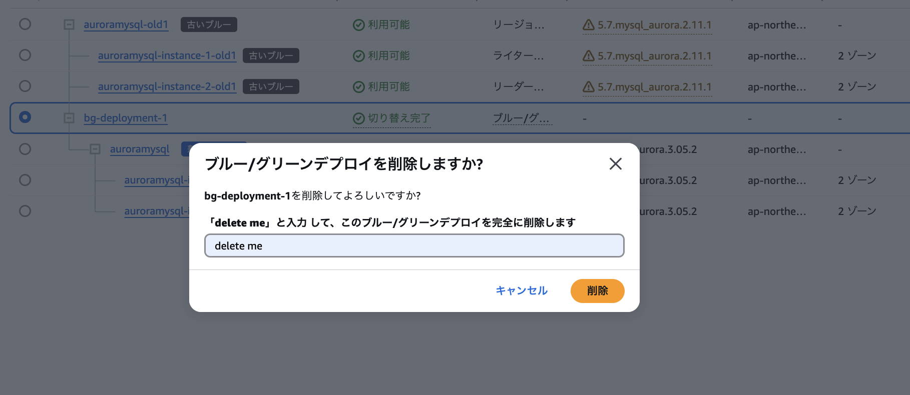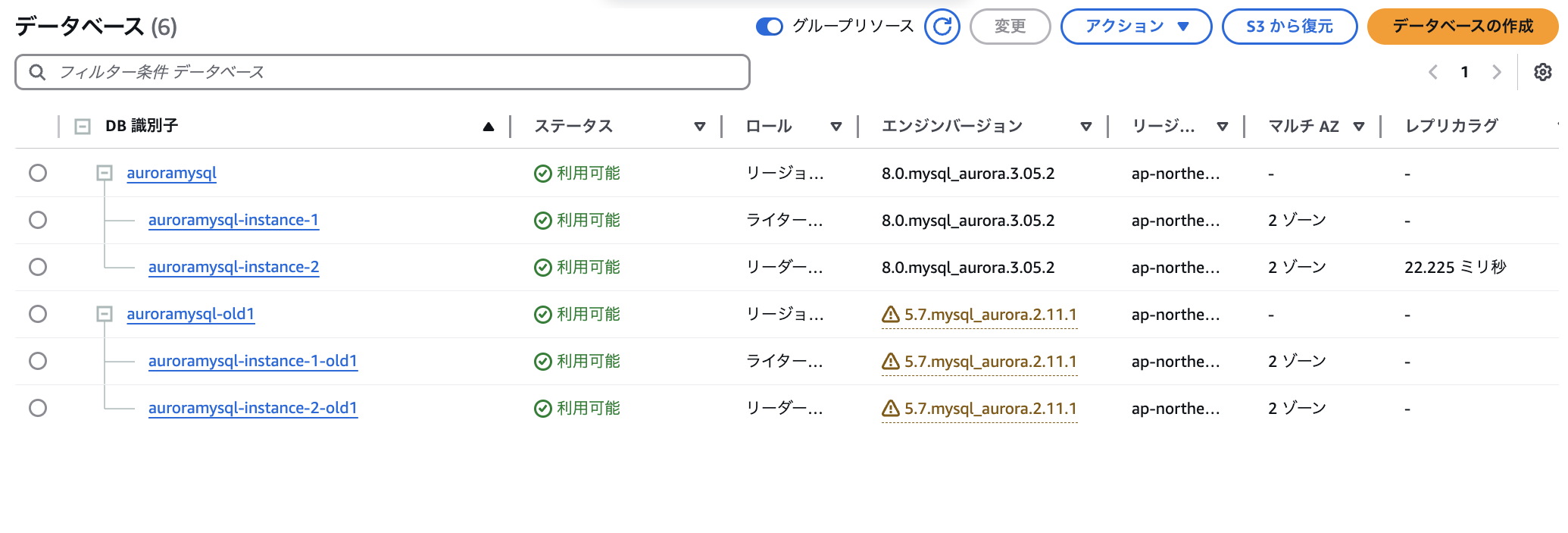 - 大規模なデータベースの場合は、まずはMySQLのバージョンを同じにしてgreen環境を作成し、その後手動でgreen環境をアップデートを実施するほうが安全です。