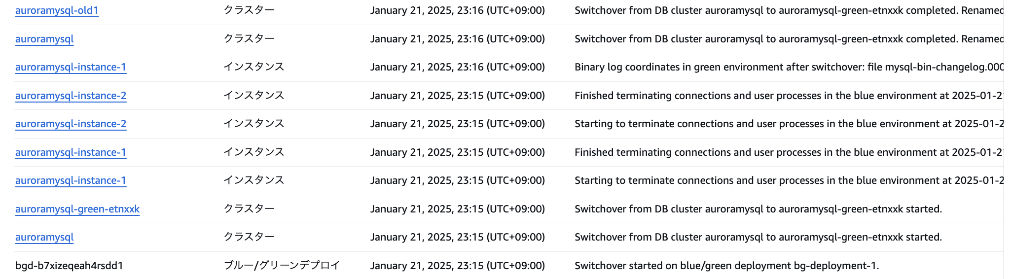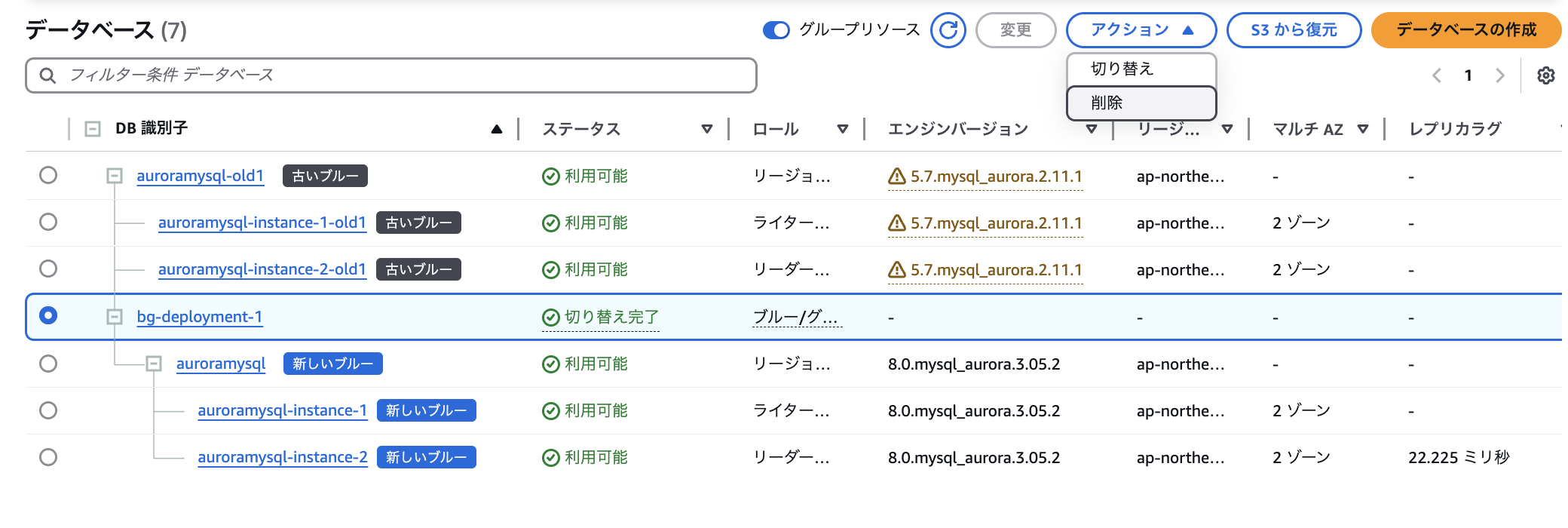 こちらを実行すると先ほどの「新しいブルー」「古いブルー」の表記が消えてそれぞれ独立したAurora RDSのようになります。