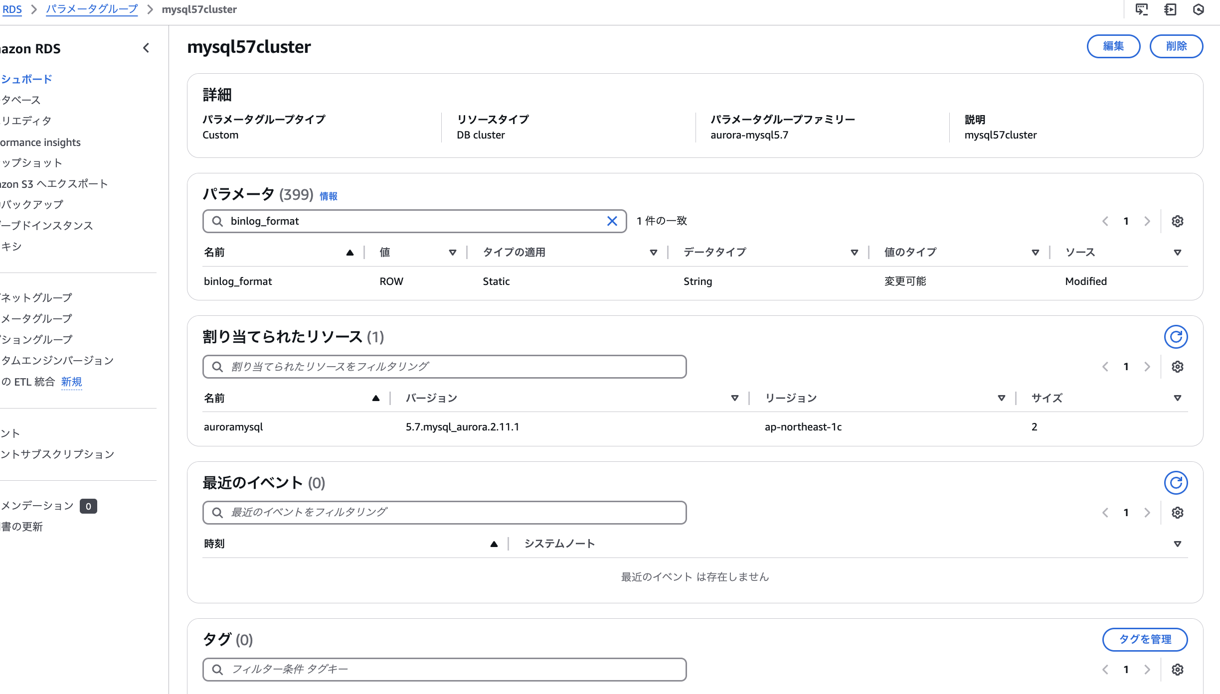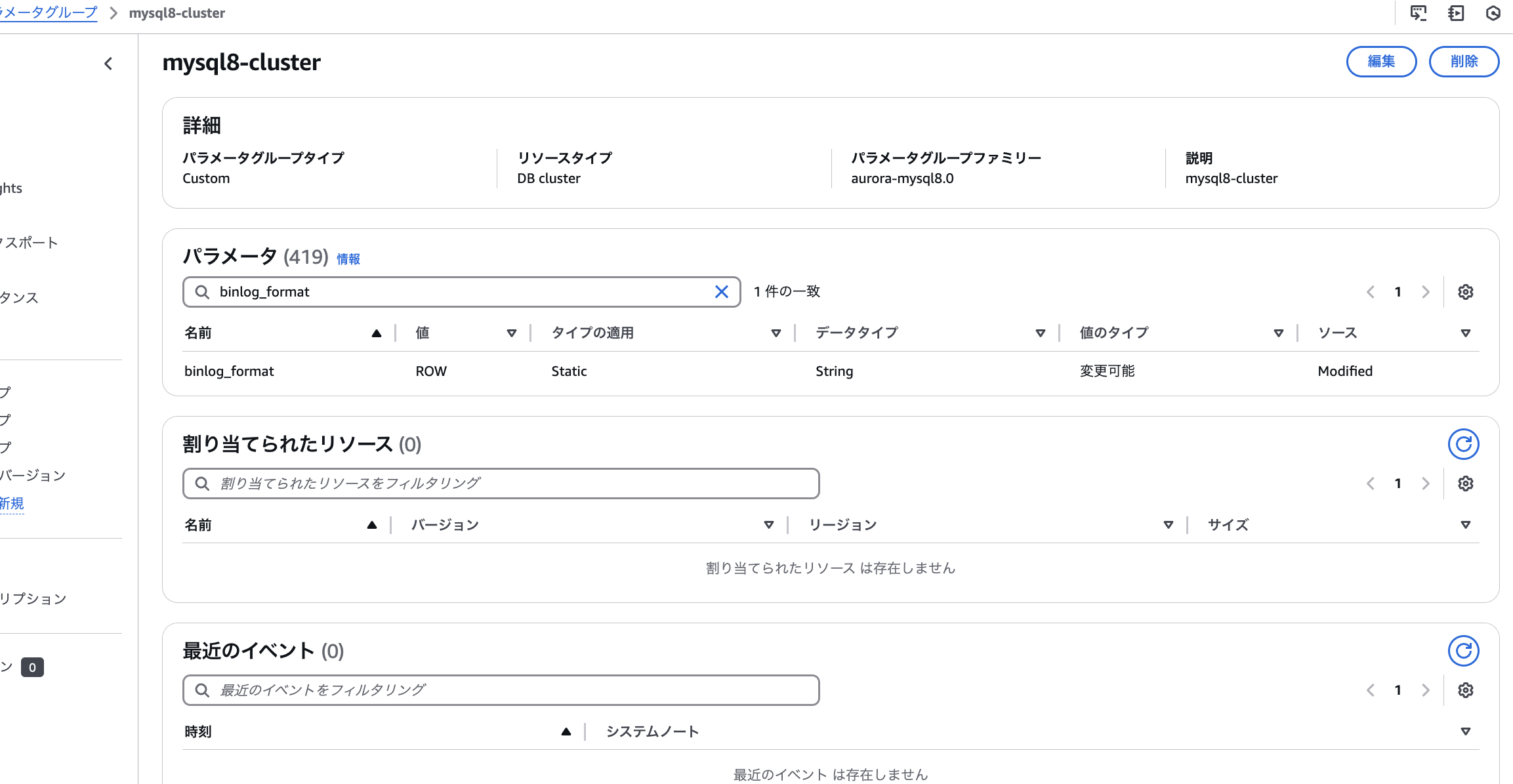 - ちなみに自分はmysql5.7用とGreenでmysql8になった後にも更新があったりしたら困るのでmysql8のパラメーターグループにもbinlog_format を ROW 設定しました。(下記の画像)