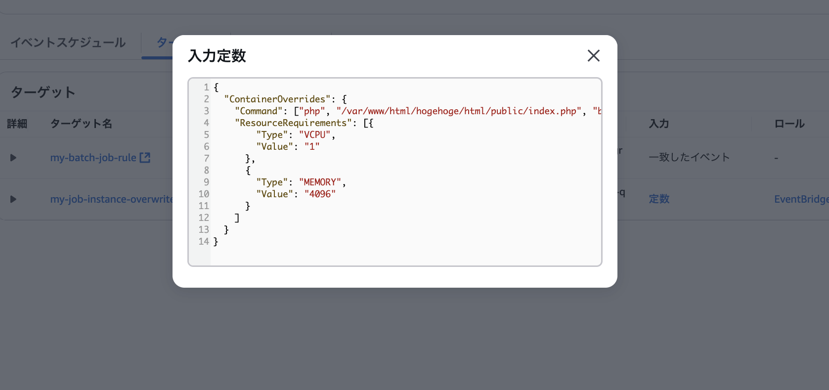 Commandのパラメータは適用されるが、ResourceRequirementsはEventBridgeのターゲットからBatchジョブに渡されません。ただし、新しいEventBridge Scheduler 機能を使用してユースケースを実現することをお勧めします。