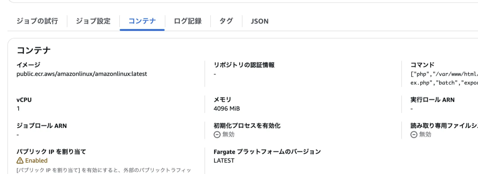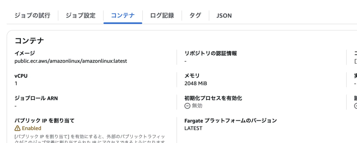 AWS Batchでバッチ処理を行うために、以下のジョブ定義を設定していました。