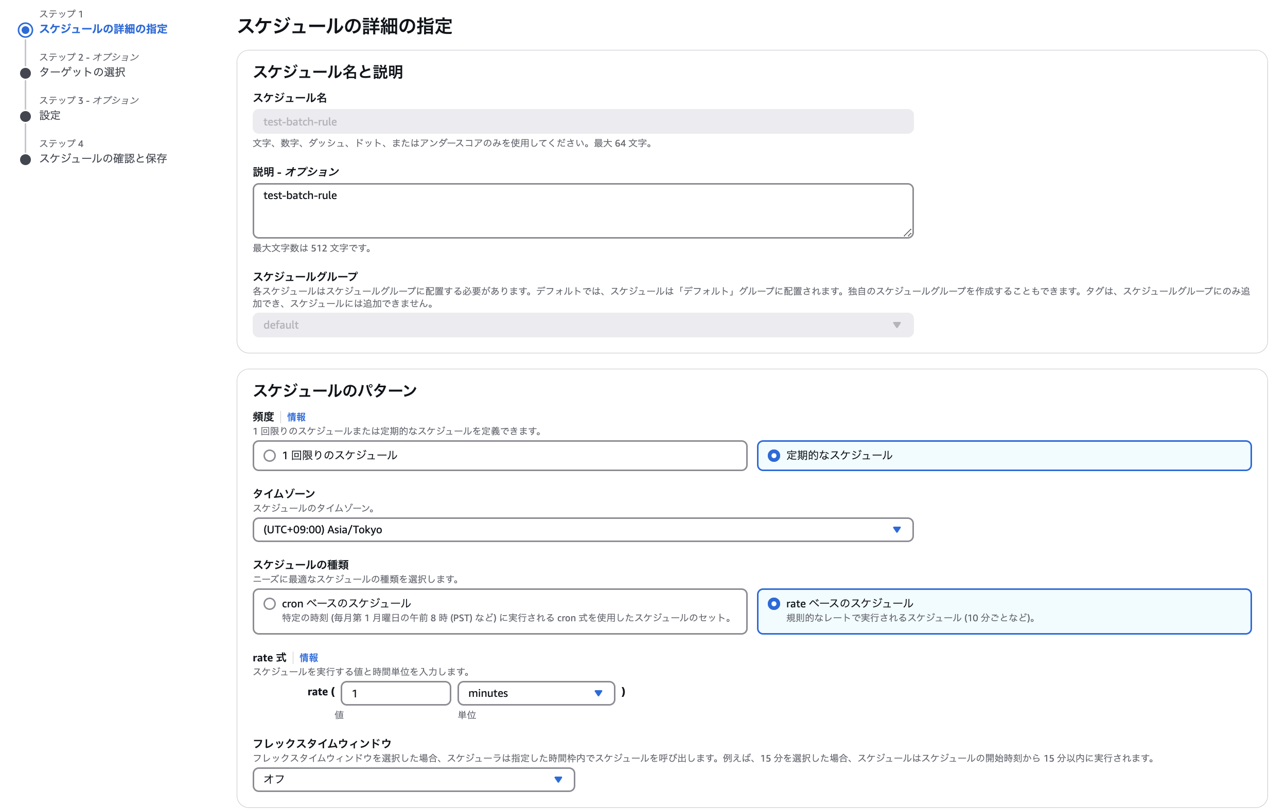 このように、AWS BatchでFargateを使用し、EventBridgeルール経由でリソース変更が適用されない場合は、EventBridge Schedulerを使用することで解決可能です。