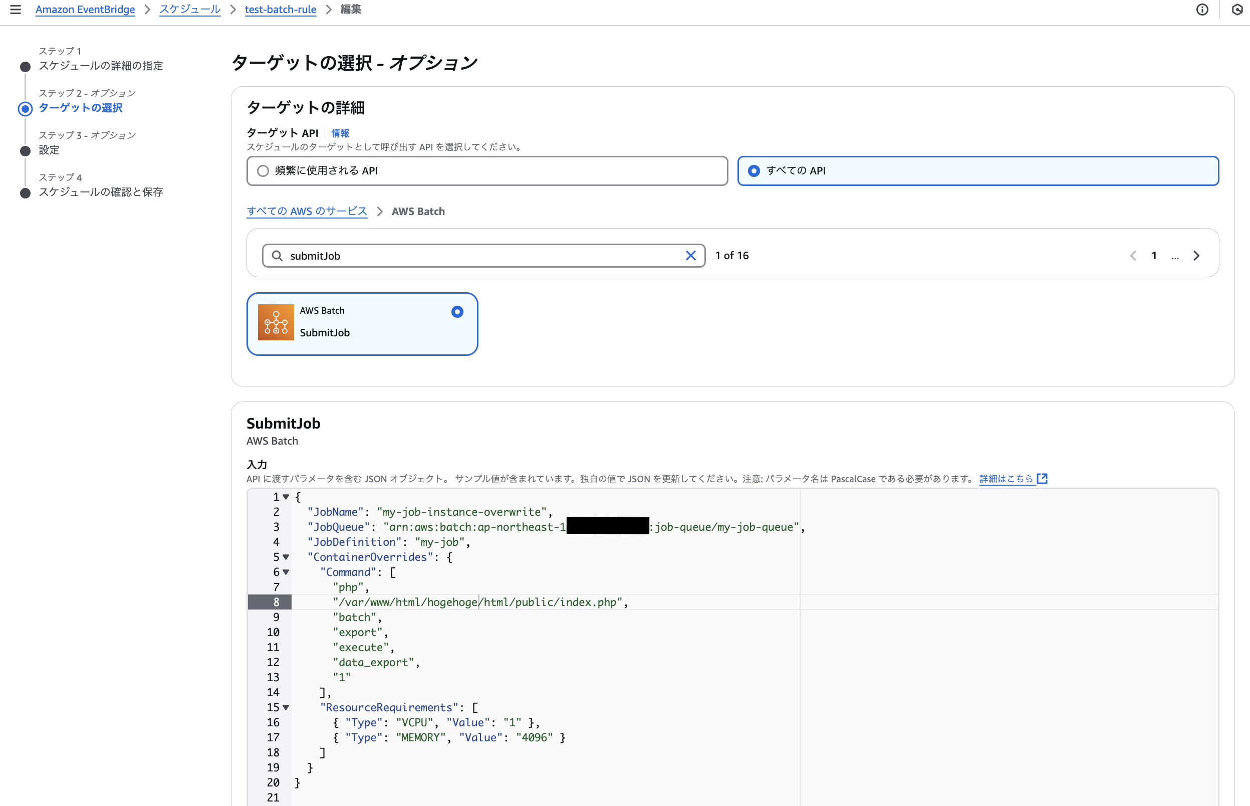 3 "JobQueue": "arn:aws:batch:ap-northeast-1:(自分のアカウントID):job-queue/my-job-queue",