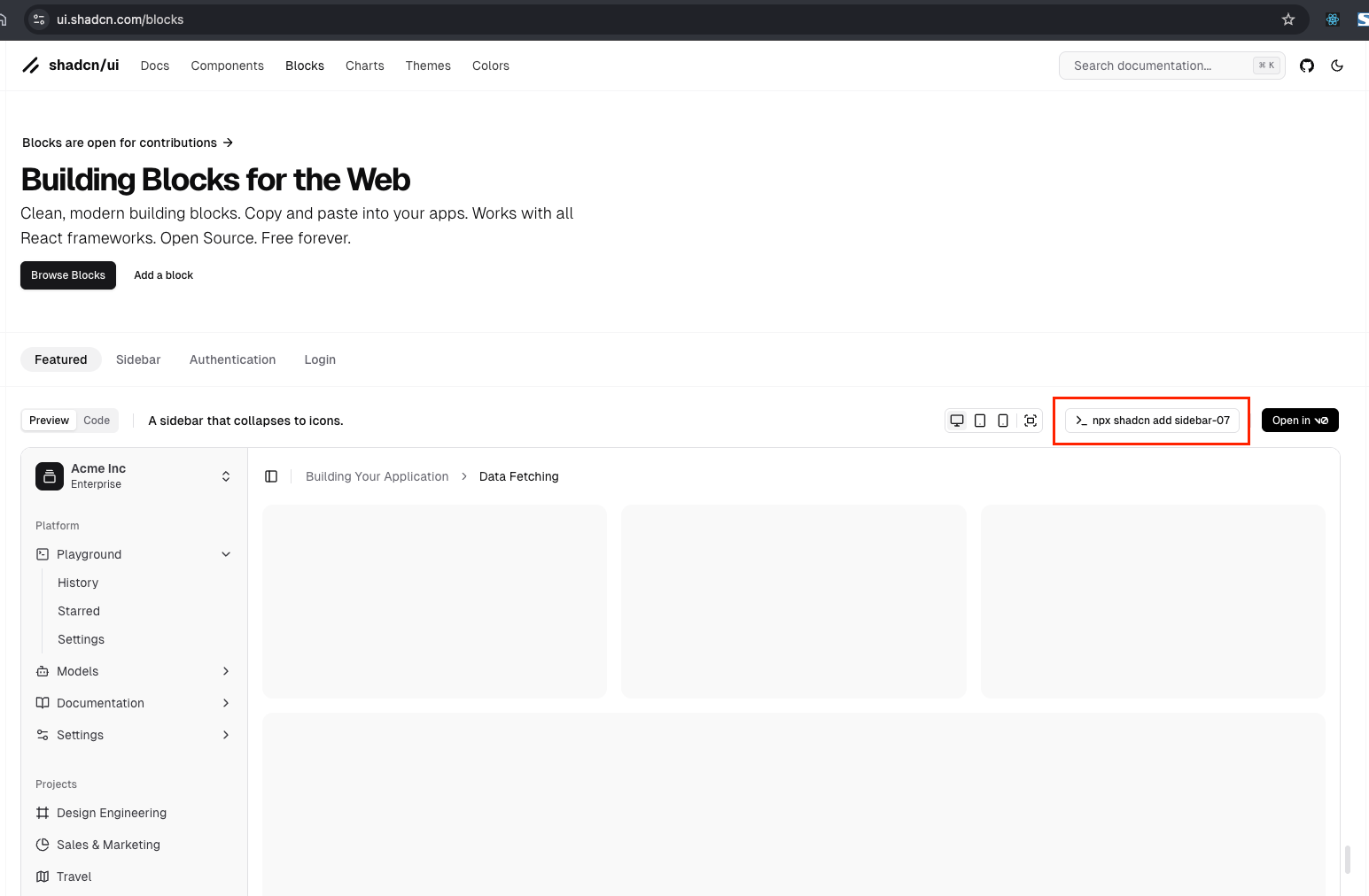 shadcn/uiには、「Blocks」 という便利なページがあります。ここでは、管理画面のレイアウトを簡単に組めるテンプレートが提供されています。
