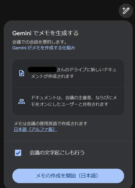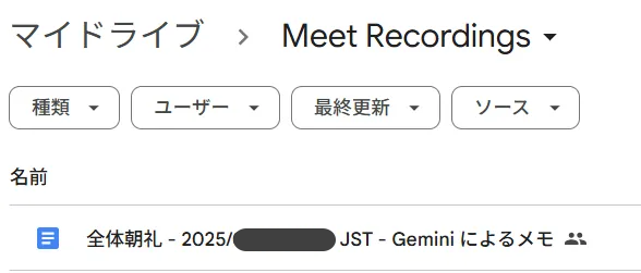 自動文字起こしをオンにした会議で、終了時に会議の主催者のGoogleドライブの「マイドライブ」に保存されます。