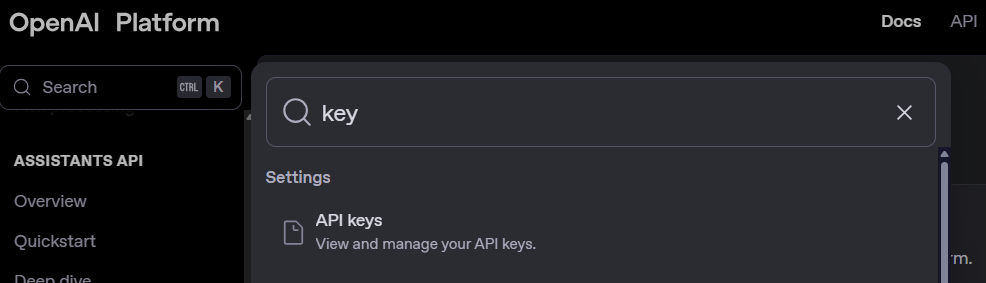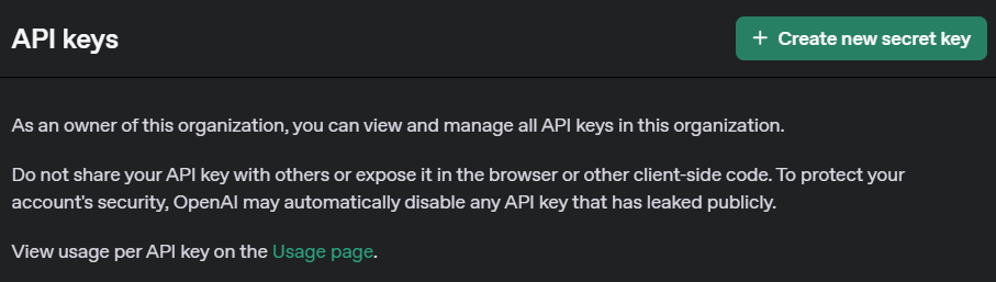 OpenAI Platformにログインし、 sk- から始まるAPI用のSecret Keyを作成して控えておきます。