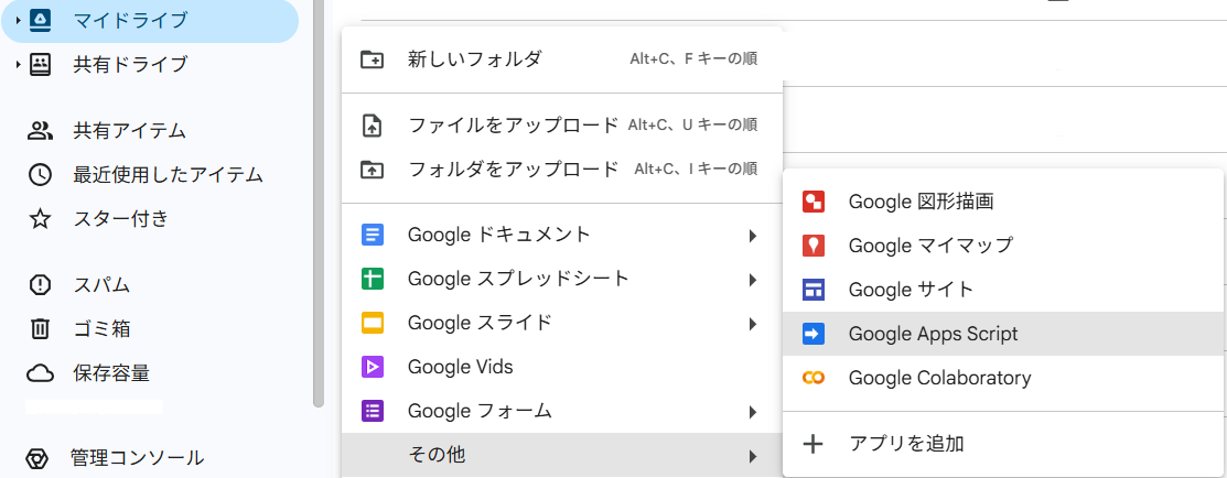 Googleドライブにログインし、右クリックメニューの「その他」から「Google Apps Script」を選択します。