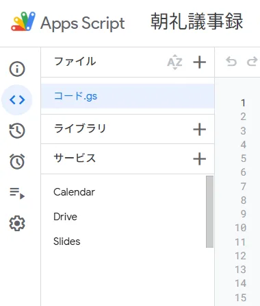 作成したGoogle Apps Scriptの編集画面の左横にある「サービス」の+ボタンから
