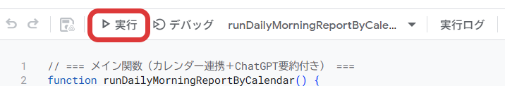 「runDailyMorningReportByCalendar」関数を「▶ 実行」で手動実行します。