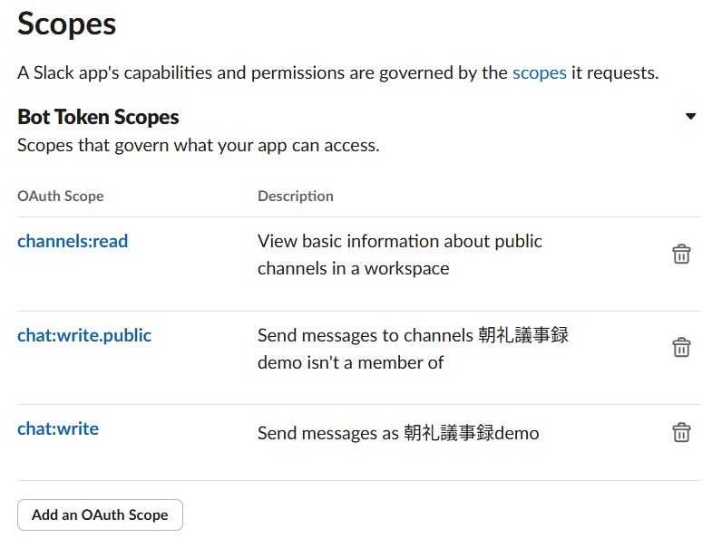 「OAuth & Permissions」に移動し、「Bot Token Scopes」の「Add an OAuth Scope」に以下を設定します。