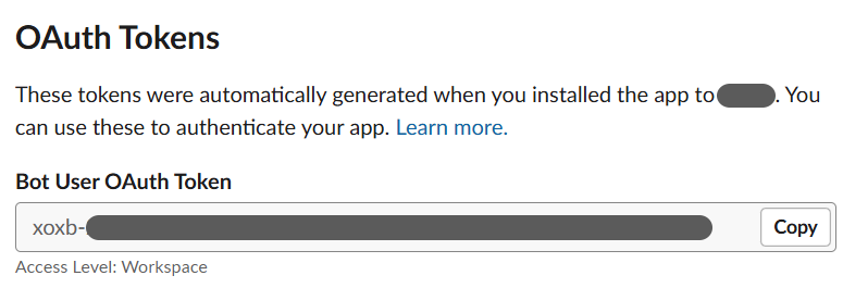 3chat:writeすると、OAuth Tokens に xoxb- から始まる「Bot User OAuth Token」が追加されるので、こちらを控えておきます。
