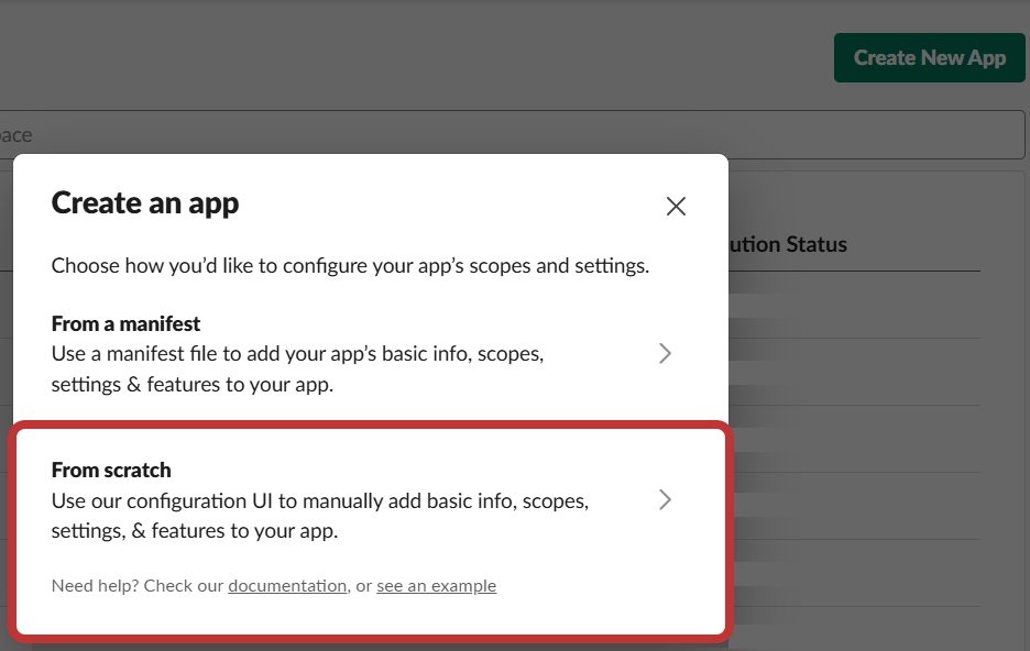 Slack API画面にログインし、「Create New App」よりSlack botを新規作成します。