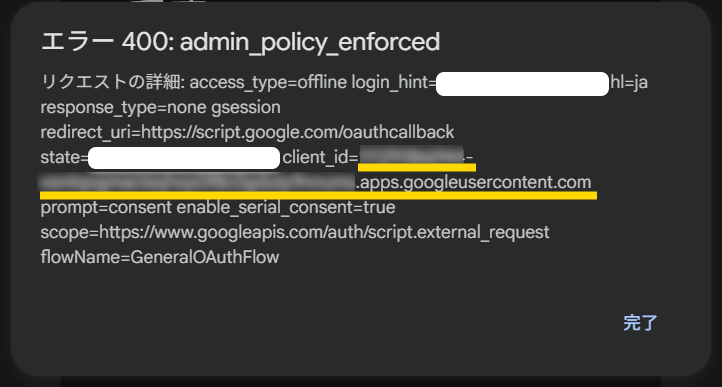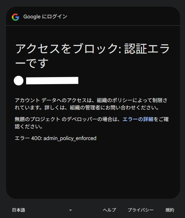 なお、Google Workspaceの設定によっては下記のようなエラーが表示される場合があります。