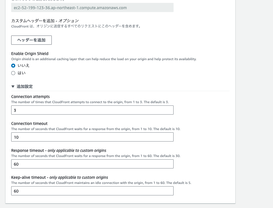 オリジンサーバー(EC2)からCloudFrontに対して60秒以上レスポンスがない場合はタイムアウトする