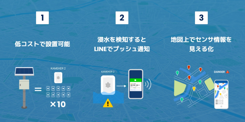もともと弊社には、ワイヤレスで水害を検知できるタイプの「ワンワンセンサー」というサービスがあって、より広い範囲を検知するためにインターネットを介した通信にしようと考えたのが「KAMEKER」誕生のきっかけです。