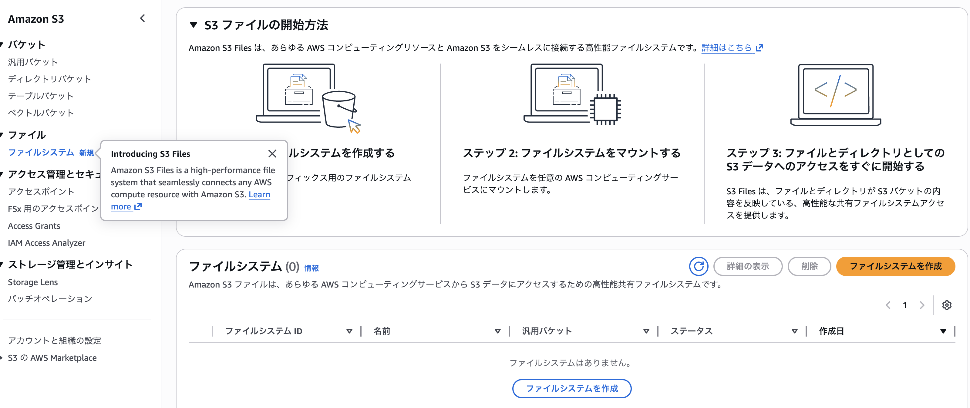 S3のメニューに「ファイルシステム」というのが増えてる